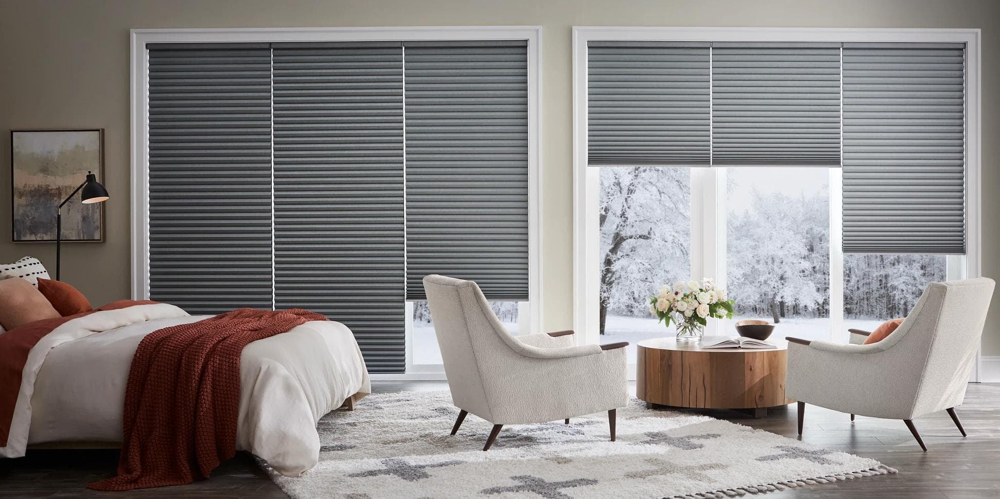 Les stores alvéolés sont un autre choix très apprécié et sont parfaits pour contrôler la lumière à travers les fenêtres de votre chambre à coucher. Élégants et faciles à utiliser, ils offrent une couche d'isolation supplémentaire qui aide à contrôler la température pendant votre sommeil, vous permettant ainsi d'économiser de l'argent et de l'énergie. Ils sont disponibles dans de nombreux motifs, couleurs et tissus. Grâce à tous leurs avantages, ces stores sont sans aucun doute les meilleurs choix pour l'habillage des fenêtres de la chambre à coucher. Pour un contrôle supérieur de la lumière et un réglage de l'intimité, envisagez le fonctionnement BandLift de haut en bas/de bas en haut; pour un contrôle plus avancé de la lumière, envisagez nos stores obscurcissants.
