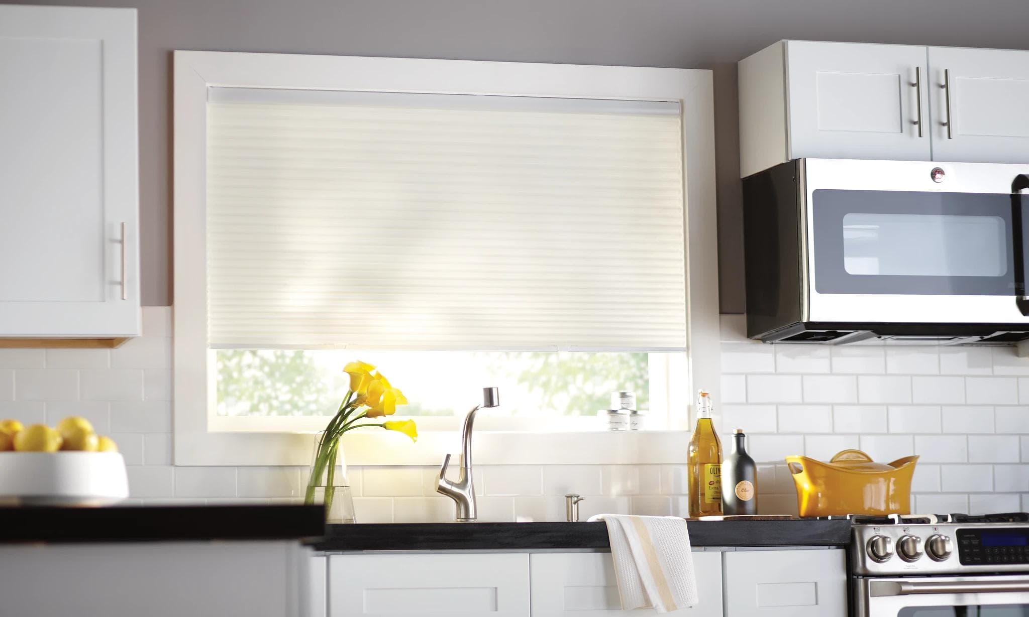 La quantité de lumière naturelle dans la pièce doit également être prise en compte lorsque vous réfléchissez à la manière de choisir les couvre-fenêtres de votre cuisine qui vous conviennent le mieux. En fonction de l'orientation des fenêtres de votre cuisine, vous pouvez réfléchir à la quantité de lumière solaire directe ou indirecte qui pénètre dans la pièce. Les rayons UV peuvent être un défi pour vos yeux, votre peau, vos meubles et vos planchers en bois. Sans oublier que le soleil fait grimper la température d'une pièce déjà chaude.